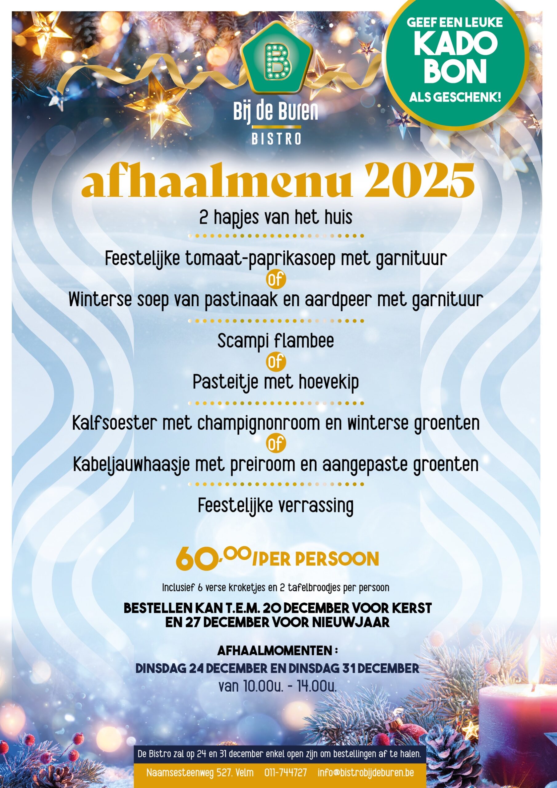 Bestellen kan op 011 744 727 of info@bistrobijdeburen.be.